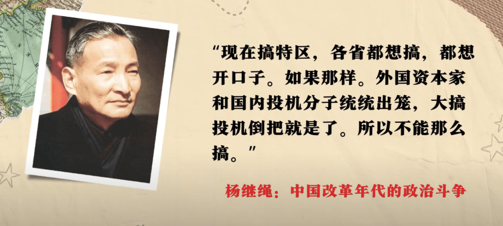 更典型的例子啊,就是对于经济特区的态度。1982年春节,邓小平刚刚开始搞经济特区的时候,陈云就提出了反对意见。他说:“现在搞特区、各省都想搞,都想开口子。如果那样,外国资本家和国内投机分子统统出笼,大搞投机倒把就是了。所以不能那么搞。”