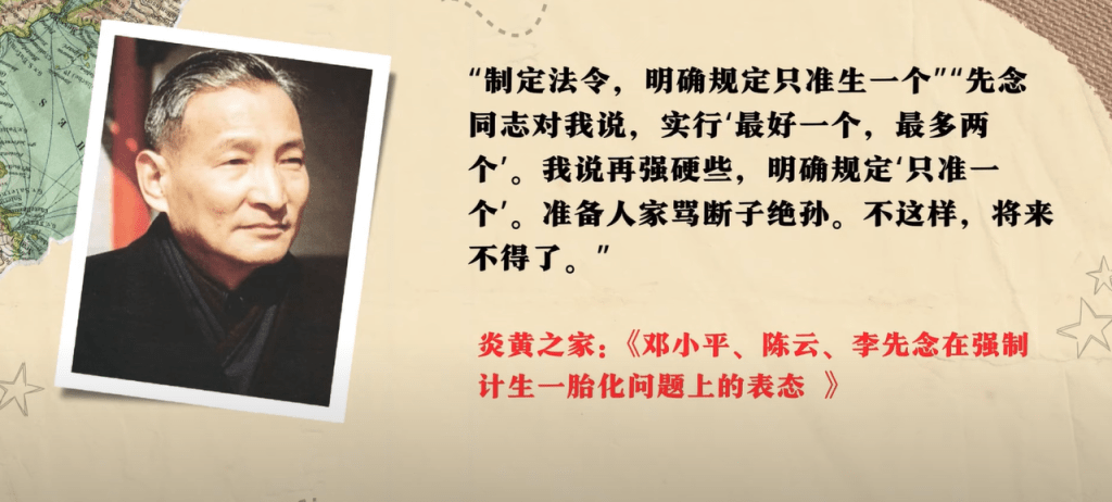 其实,陈云对于今天的中国,留下的政治遗产非常多。比如啊,中共党内至今还经常把反对资产阶级自由化、防止和平演变,作为意识形态管控的出发点,时刻不忘牢牢掌控国有企业作为经济命脉。这些都是当年陈云政治主张的遗留。中共的核心权力圈,从江泽民开始到习近平称帝之前啊,几乎全是和陈云的派系沾亲带故的。在很多具体的政策层面啊,也有陈云的影响。最典型的就是计划生育,这个祸国殃民的政策被定为国策,陈云就是主导者。计划生育其实是他计划经济的一部分。