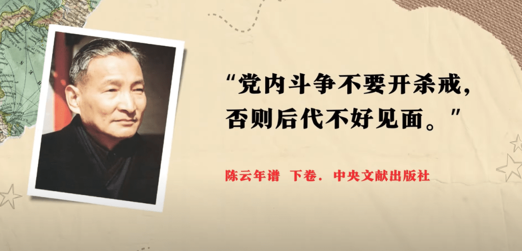 比如在审判四人帮的时候,怀有深仇大恨的邓小平就主张枪毙江青和张春桥,而陈云就认为啊,党内斗争不能乱杀,坚决反对。他还说了一段著名的话:“如果我一票反对,也要记录在案。” 陈云之所以不开杀戒,不是因为他仁慈,而是因为他有一句著名的遗训:“党内斗争不要开杀戒,否则后代不好见面。” 也就是说,他之所以不赞成开杀戒,归根结底还是考虑到红色子孙将来彼此的关系问题,怕有一天这个回旋镖打到自己的子孙。如果杀的是老百姓和学生,就像“六四”的天安门一样,他是毫不犹豫会赞成的。