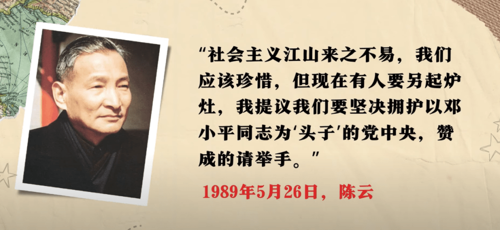1989年的5月26号,正是北京学生运动高潮的时期。中共的元老组成的中央顾问委员会召开秘密会议,商讨应对措施。在这个会议上,中顾委的主任陈云公开支持邓小平,主张以军事手段来镇压学生运动。陈云说了这么一段话:“社会主义江山来之不易,我们应该珍惜,但现在有人想要另起炉灶。我提议我们要坚决拥护以邓小平同志为‘头子’的党中央,赞成的请举手。”
