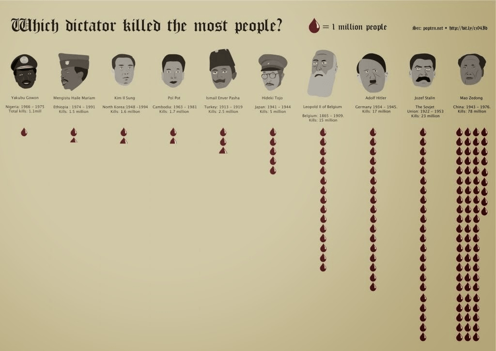 可是,当人类社会进入人权至上的文明时期以后,在和平年代,毛泽东却整死、害死、饿死、杀死了7800万人——不同于抗日战争日本人杀中国人,这是中国人杀中国人——而且,数量几近战时日本人杀中国人的10倍!