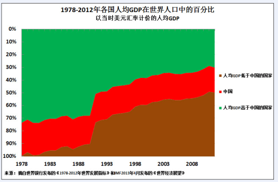 第二,前英国伦敦经济与商业政策署署长罗思义对对世界银行发布的《1978—2012年世界发展指标》和IMF在2013年4月发布的《世界经济展望》的分析,在1978年改革开放之初,中国是世界上最贫穷的国家之一——当时只有0.5%的世界人口人均GDP低于中国,73.5%的人则生活在高于中国的国家 — 中国自身就占了25.9%的世界总人口。到了2010年,用同样的方法计算,生活在人均GDP高于中国的国家的人口只占到世界总人口的31.3% ……