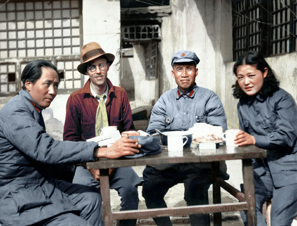 一九三七年五月卅一日,我应邀前往探望住在山坡的宽敞窑洞里的美国新闻记者史沫特莱……我在日记里写道,吴光伟烹调胡椒鸡蛋,史沫特莱从菜馆叫人送来白菜汤。正当我们开始谈话之际,毛泽东进来了。