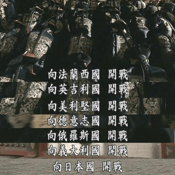 杀了使节,已无退路的慈禧于6月21日,以光绪帝的名义向有驻京使节的英、美、法、德、意、日、俄、荷兰、奥匈、西班牙、比利时11国发布《宣战诏书》,扬言“大张挞伐、一决雌雄”。一个连新兴的日本都打不过,割地赔款的《马关条约》还历历在目的朝廷,居然敢向包括日本在内的额11国宣战!什么样的鸡血,能打出这样愚昧的胆魄?